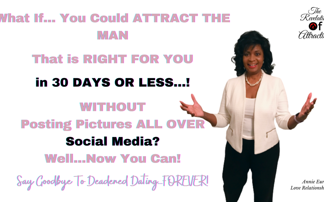 What If you could attract the man that right for you in 30 days or less by ANNIE EURE | 0 comments annie eure website cover page for the revelation of attraction Submit a Comment Cancel replyYour email address will not be published. Required fields are marked *Comment Name * Email * Website Save my name, email, and website in this browser for the next time I comment.